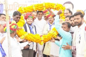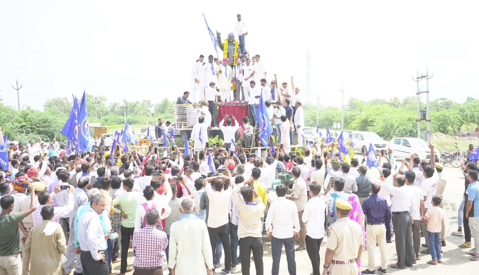 केकड़ी: मूर्ति अनावरण समारोह में अतिथियों का माल्यार्पण कर स्वागत करते बाबा साहब के अनुयायी।