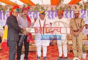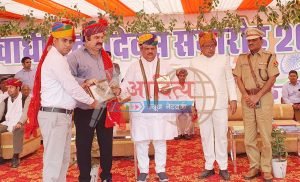 केकड़ीः जिला स्तरीय स्वतंत्रता दिवस समारोह के दौरान उत्कृष्ट कार्य के लिए एसडीएम विकास पंचोली को सम्मानित करते अतिथि।