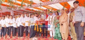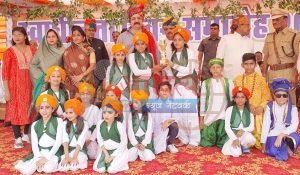 केकड़ीः जिला स्तरीय स्वतंत्रता दिवस समारोह के दौरान सामूहिक नृत्य प्रस्तुत करने वाले बच्चों को सम्मानित करते अतिथि।