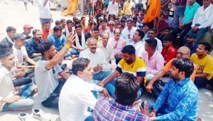 केकड़ी: उपखण्ड कार्यालय के समक्ष हनुमान चालीसा का पाठ करते हिन्दुवादी संगठनों के कार्यकर्ता।