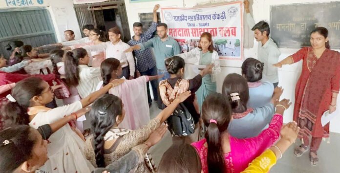 केकड़ी, 11 नवम्बर (आदित्य न्यूज नेटवर्क): राजकीय महाविद्यालय में मंगलवार को मतदाता साक्षरता क्लब (Voter Literacy Club-ELC) के तत्वावधान में विशेष कार्यक्रम आयोजित कर शत प्रतिशत मतदान की शपथ दिलाई गई। प्राचार्य डॉ. किरोड़ी लाल मीना ने विद्यार्थियों को संबोधित करते हुए मतदान की शक्ति पर प्रकाश डाला। उन्होंने कहा कि मतदाता का एक मत लोकतंत्र को सशक्त बनाता है। उन्होंने विद्यार्थियों से भावनात्मक अपील करते हुए कहा कि वे न केवल स्वयं अनिवार्य रूप से मतदान करें, बल्कि अपने आस-पास के सभी लोगों, विशेषकर परिवार व पड़ोसियों को भी मतदान के लिए जागरूक व प्रेरित करें।