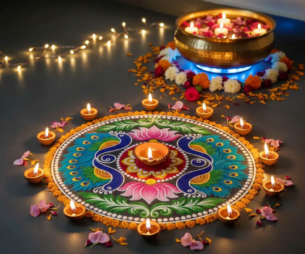 केवल फूलों की रंगोली: यह सबसे आसान, सुगंधित व पर्यावरण के अनुकूल तरीका है। यदि आपके पास रंग नहीं हैं, तो ताजे फूलों (गेंदा, गुलाब, चमेली) व पत्तों का उपयोग करके सुंदर रंगोली बनाएं। यह न सिर्फ खूबसूरत दिखती है, बल्कि पूरे घर को महका भी देती है।