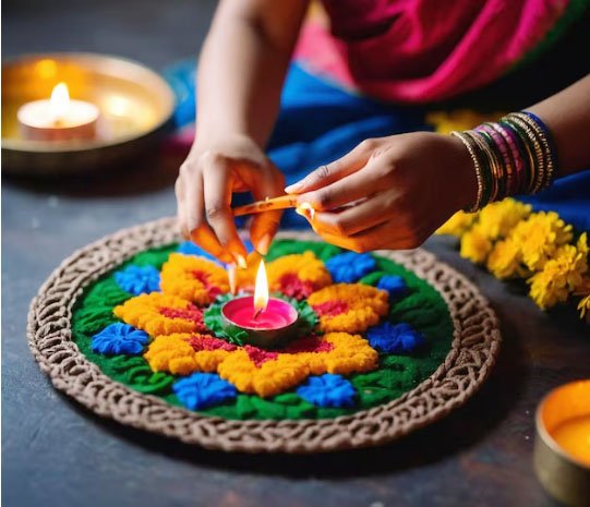केवल फूलों की रंगोली: यह सबसे आसान, सुगंधित व पर्यावरण के अनुकूल तरीका है। यदि आपके पास रंग नहीं हैं, तो ताजे फूलों (गेंदा, गुलाब, चमेली) व पत्तों का उपयोग करके सुंदर रंगोली बनाएं। यह न सिर्फ खूबसूरत दिखती है, बल्कि पूरे घर को महका भी देती है।