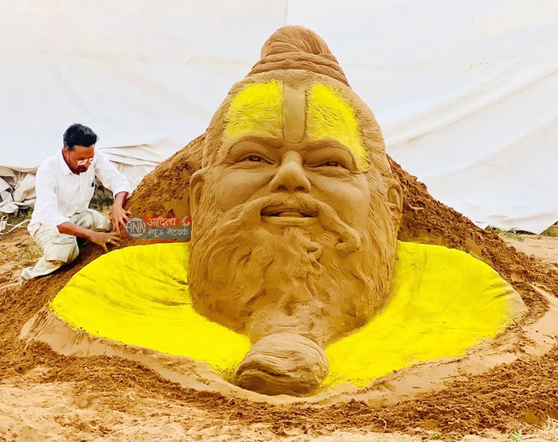 केकड़ी: पुष्कर के धोरों में बालू मिट्टी से संत प्रेमानन्द महाराज की कलाकृति बनाते सेंड आर्टिस्ट अजय रावत।