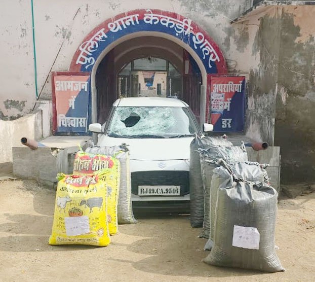 केकड़ी, 01 जनवरी (आदित्य न्यूज नेटवर्क): अवैध मादक पदार्थों के विरुद्ध चलाए जा रहे विशेष अभियान के तहत केकड़ी शहर थाना पुलिस को नए साल की पूर्व संध्या पर एक बड़ी सफलता हासिल हुई है। पुलिस ने जयपुर रोड पर कल्याणपुरा धुवालिया के पास से भारी मात्रा में अवैध डोडा-पोस्त व तस्करी में प्रयुक्त एक कार जब्त की है। थानाधिकारी कुसुमलता मीणा ने बताया कि सदर थाना पुलिस के हैड कांस्टेबल राजेश के जरिए मिली सूचना के आधार पर एक पुलिस टीम जयपुर रोड स्थित कल्याणपुरा धुवालिया पहुंची। वहां सड़क किनारे एक सफेद रंग की स्विफ्ट कार संदिग्ध व क्षतिग्रस्त हालत में खड़ी मिली। कार के चारों खिड़कियों व आगे-पीछे के कांच टूटे हुए थे। पुलिस टीम ने कार की डिक्की व फाटकों को खोलकर तलाशी ली, तो उसमें काले व पीले रंग के 7 प्लास्टिक के कट्टे डोडा पोस्त से भरे हुए मिले। पुलिस ने वजन करवाया तो कट्टों में 150.640 किलोग्राम डोडा-पोस्त भरा मिला।