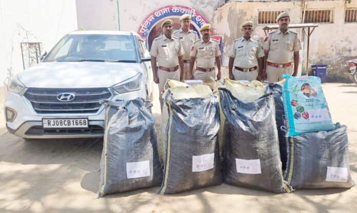 केकड़ी, 24 सितंबर (आदित्य न्यूज नेटवर्क): केकड़ी शहर थाना पुलिस ने अवैध मादक पदार्थों की तस्करी के खिलाफ कार्रवाई करते हुए 191.900 किलोग्राम अवैध डोडापोस्त के साथ एक कार, एक लोडेड पिस्टल व 4 जिंदा कारतूस जब्त किए है। प्राप्त जानकारी के अनुसार एएसआई छोटू सिंह के नेतृत्व में गश्त कर रही पुलिस टीम को जयपुर-अजमेर बाईपास पर एक सफेद क्रेटा कार संदिग्ध अवस्था में खड़ी मिली। कार के पास दो युवक खड़े थे जो पुलिस जीप को देखते ही अंधेरे का फायदा उठाकर फरार हो गए।