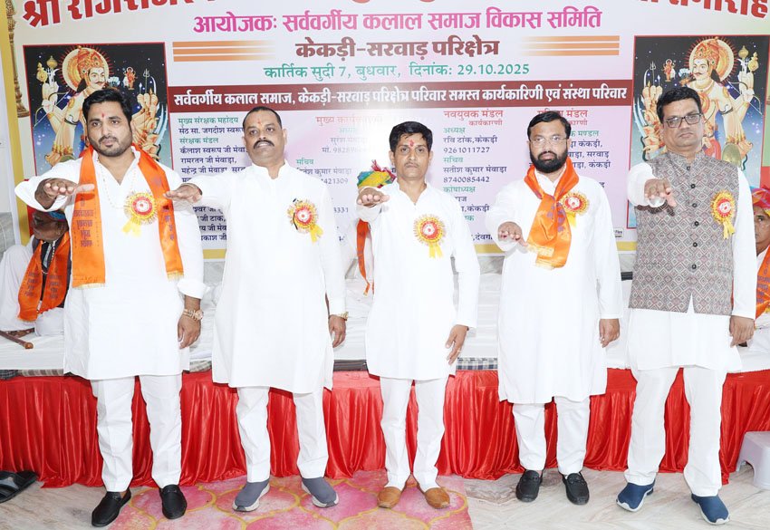 केकड़ी, 29 अक्टूबर (आदित्य न्यूज नेटवर्क): सर्ववर्गीय कलाल समाज विकास समिति केकड़ी सरवाड़ परिक्षेत्र के तत्वावधान में बुधवार को कोटा रोड स्थित होटल लक्ष्मी पैलेस में राज राजेश्वर सहस्त्रबाहु अर्जुन जयंती, नवगठित कार्यकारिणी का शपथ ग्रहण समारोह एवं सम्मान समारोह का आयोजन किया गया। इस मौके पर मुख्य संरक्षक जगदीश स्वरूप मेवाड़ा मुख्य अतिथि एवं संरक्षक मण्डल के सदस्य विशिष्ट अतिथि के रूप में उपस्थित रहे। शुरूआत में अतिथियों ने राज राजेश्वर सहस्त्रबाहु अर्जुन के चित्र के समक्ष दीप प्रज्जवलन किया। समाज की बालिकाओं ने रंगारंग सांस्कृतिक कार्यक्रम प्रस्तुत किए।