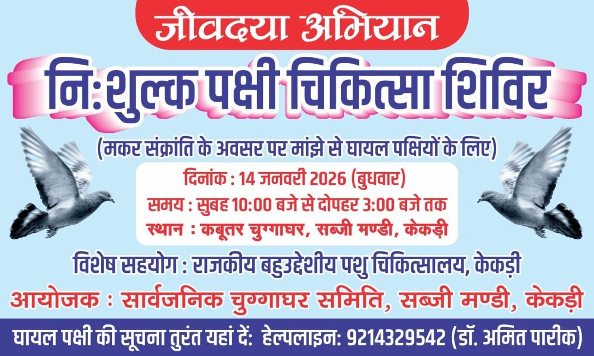केकड़ी, 13 जनवरी (आदित्य न्यूज नेटवर्क): मकर संक्रांति के पर्व पर पतंगबाजी के दौरान मांझे से घायल होने वाले बेजुबान पक्षियों को जीवनदान देने के लिए कबूतर चुग्गाघर समिति सब्जी मण्डी एवं बहुउद्देशीय पशु चिकित्सालय केकड़ी के संयुक्त तत्वावधान में 14 जनवरी को एक विशेष पक्षी चिकित्सा शिविर का आयोजन किया जाएगा। समिति के अध्यक्ष प्रदीप लोढ़ा ने बताया कि बुधवार को सब्जी मण्डी स्थित कबूतर चुग्गाघर परिसर के बाहर सुबह 10 बजे से दोपहर 3 बजे तक चिकित्सा टीम तैनात रहेगी। इस दौरान बहुउद्देशीय पशु चिकित्सालय के अनुभवी कार्मिक मांझे से कटे व घायल पक्षियों का मौके पर ही त्वरित उपचार व ड्रेसिंग करेंगे।