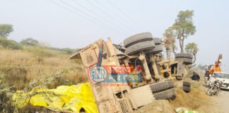 यूरिया खाद से भरा ट्रेलर पलटा, सड़क पर बिखरे खाद के...