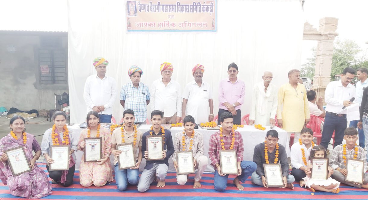ये प्रतिभाएं हुई सम्मानित: प्रतिभा सम्मान समारोह में राजकीय सेवा में नवीन नियुक्ति पर सरोज कुमारी वैष्णव मालपुरा, मंजू कुमारी वैष्णव शाहपुरा, शिवप्रसाद वैष्णव इंदोली, आधार हाउसिंग फाइनेंस अजमेर में ब्रांच क्रेडिट मैनेजर बनने पर आशीष वैष्णव केकड़ी, एचडीबी फाइनेंशल सर्विसेज दुर्गापुरा जयपुर में सीनियर सेल्स मैनेजर बनने पर सुनील वैष्णव कंवरपुरा, माध्यमिक व उच्च माध्यमिक बोर्ड परीक्षाओं में 80 प्रतिशत से अधिक अंक प्राप्त करने पर छवि वैष्णव बहेड़ा, एकता वैष्णव लाम्बा कलां, आयुष वैष्णव तसवारिया, हरीश बैरागी भराई, आशीष कुमार वैष्णव स्यार, नेहा वैष्णव केकड़ी, अवधेश वैष्णव सापुन्दा एवं तरुण कुमार वैष्णव मेहरुकलां को माला पहनाकर व स्मृति चिह्न एवं प्रशस्ति पत्र भेंट कर सम्मानित किया गया।