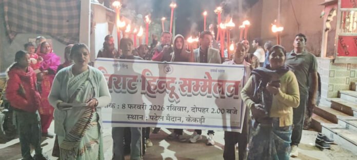 केकड़ी, 06 फरवरी (आदित्य न्यूज नेटवर्क): आगामी 8 फरवरी को आयोजित होने वाले विराट हिन्दू सम्मेलन की पूर्व तैयारी व समाज में जागरूकता लाने के लिए गुरुवार रात्रि को श्री भाग्योदेश्वर महादेव मंदिर समिति के तत्वावधान में भव्य रामधुनी एवं मशाल यात्रा निकाली गई। प्रचार प्रमुख रोहित जांगिड़ ने बताया कि सम्मेलन को सफल बनाने के लिए कार्यकर्ताओं द्वारा घर-घर जाकर अक्षत व पत्रक वितरण किए गए। मशाल यात्रा सायं 7:30 बजे महादेव मंदिर प्रांगण से शुरू हुई, जो विभिन्न क्षेत्रों जैसे एवन वाटर सप्लायर, काजीपुरा, मोदी नगर, बसंत नगर, श्रीराम सर्किल व शास्त्री नगर से होते हुए पुनः मंदिर परिसर में संपन्न हुई। यात्रा के दौरान युवाओं व महिलाओं की अच्छी उपस्थिति रही। हाथों में भगवा ध्वज व मशालें थामे श्रद्धालु रामधुन व जयकारों के साथ चल रहे थे। वक्ताओं ने इस सम्मेलन को सामाजिक एकता व सनातन मूल्यों के संरक्षण के लिए एक महत्वपूर्ण कदम बताया।