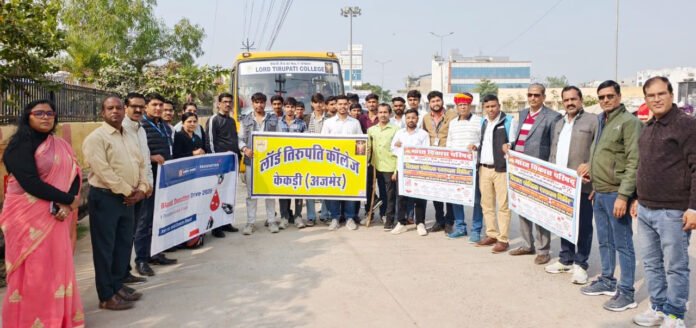 केकड़ी, 03 दिसंबर (आदित्य न्यूज नेटवर्क): भारत विकास परिषद, एचडीएफसी बैंक एवं लॉर्ड तिरुपति कॉलेज के संयुक्त तत्वावधान में बुधवार को रक्तदाता जागरूकता रैली का आयोजन किया गया। इस रैली का मुख्य उद्देश्य आगामी 5 दिसंबर को आयोजित होने वाले रक्तदान शिविर के लिए अधिकतम रक्तदाताओं को प्रेरित करना था। रैली में परिषद के पदाधिकारियों, सदस्यों, मातृशक्ति महिला मंडल के साथ-साथ लॉर्ड तिरुपति कॉलेज के छात्र-छात्राओं ने बड़ी संख्या में उत्साहपूर्वक भाग लिया। परिषद के गोपाल लाल वर्मा ने बताया कि रैली नगर पालिका गेट से शुरू होकर चौपाटी, घंटाघर, सदर बाजार, गणेश प्याऊ, खिड़की गेट, सरसड़ी गेट, शनिमंदिर, सरदार पेट्रोल पंप होते हुए पुनः चौपाटी पहुंचकर सम्पन्न हुई। रैली मार्ग में “रक्तदान महादान, 5 दिसंबर को करें रक्तदान” जैसे नारे गूंजते रहे। युवा वर्ग हाथों में बैनर व तख्तियां लेकर रक्तदान का संदेश प्रसारित कर रहे थे।